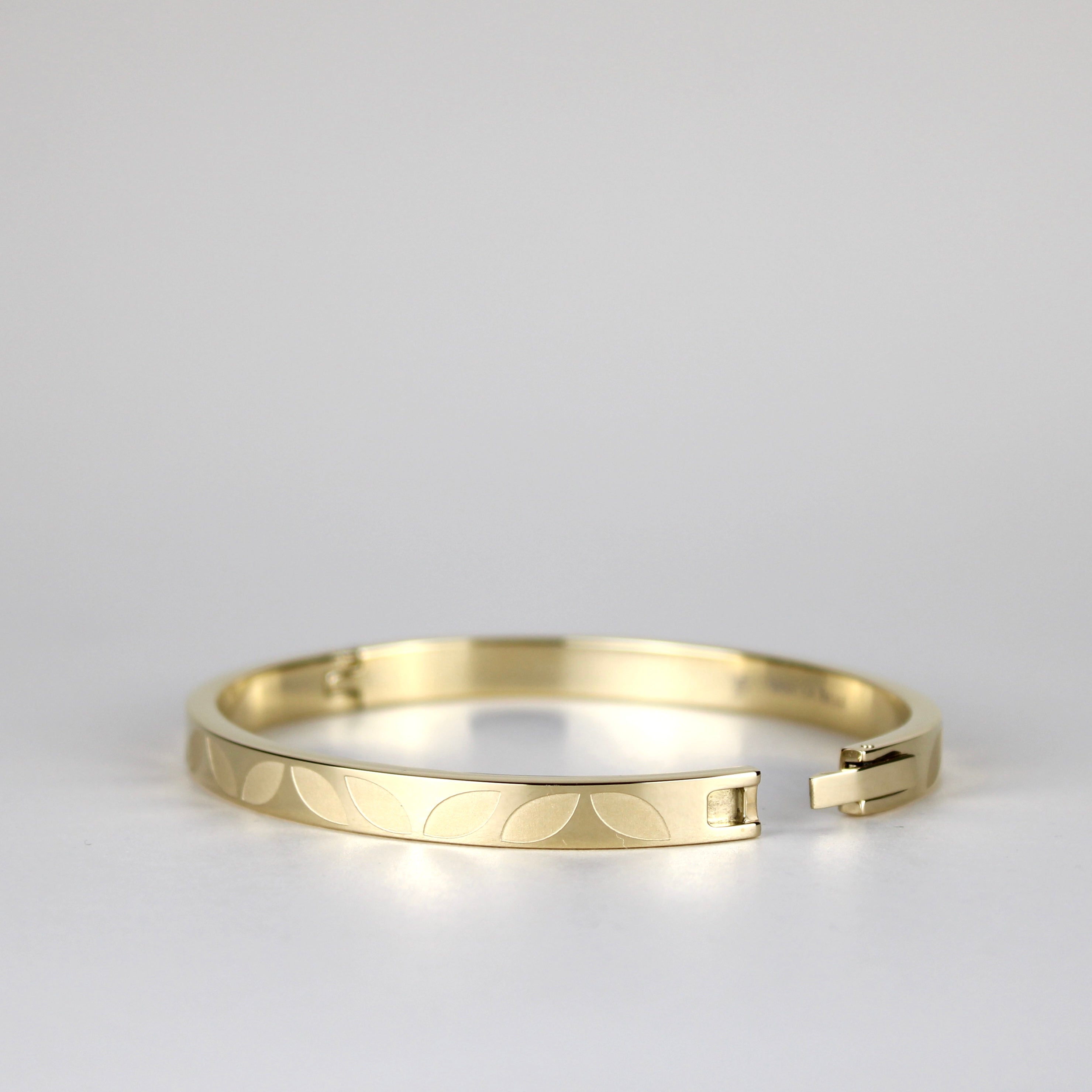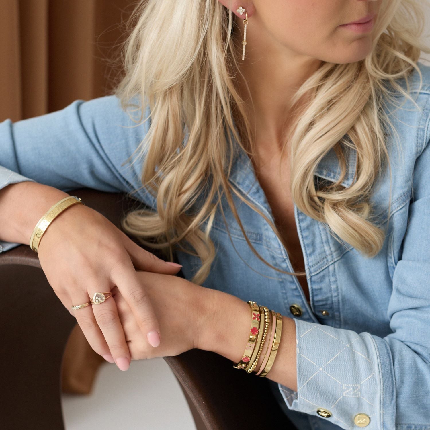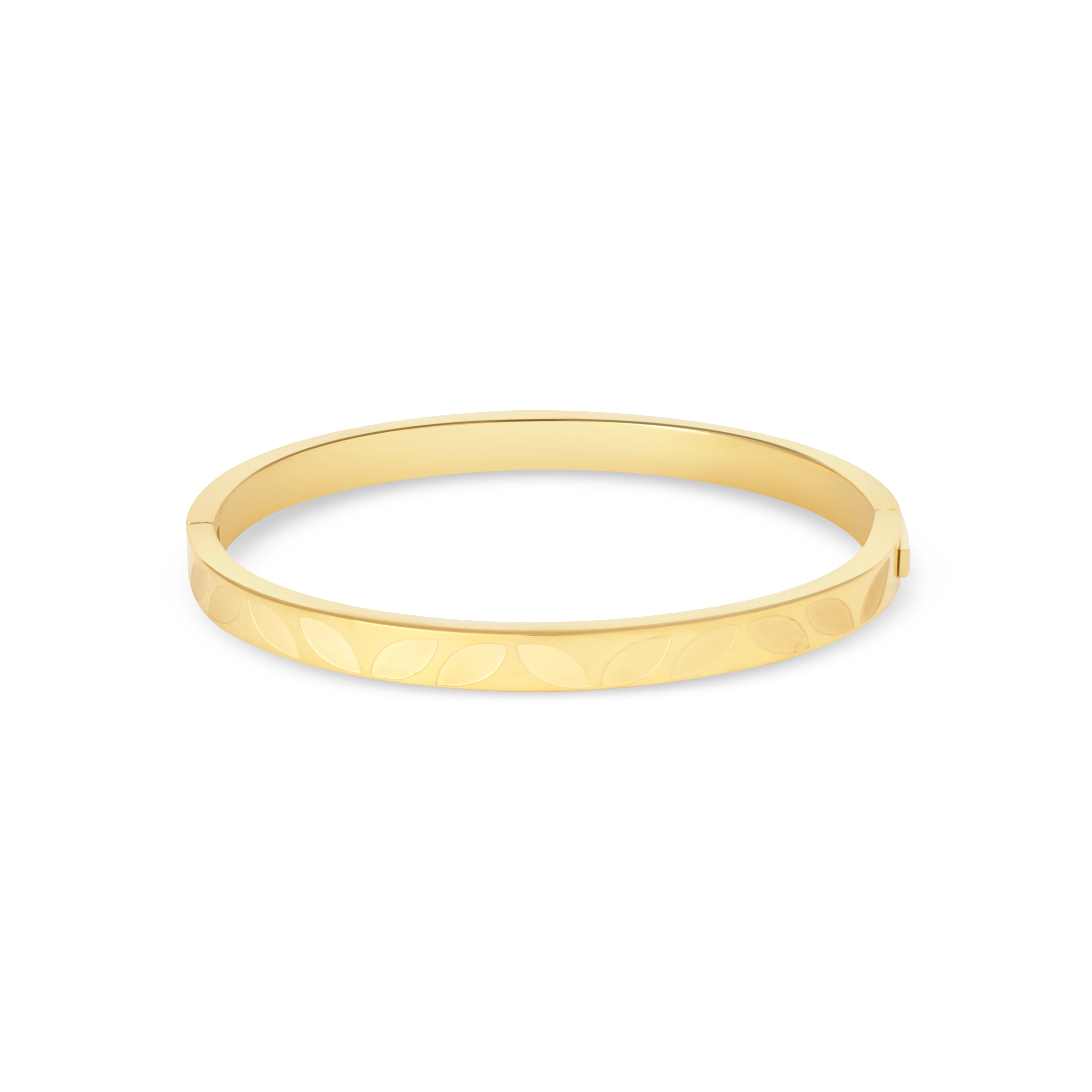 Verleihen Sie Ihrem Look mit dem Olive-Armreif einen Hauch von Bohème-Eleganz. Dieses mit 14 Karat vergoldete Armband ist dezent mit anmutigen Olivenblättern graviert, einem zeitlosen und natürlichen Motiv. Die raffinierte Gravur verleiht dem Armreif einen verspielten Boho-Chic-Look und bildet einen schönen Kontrast zu anderen Stilen in Ihrer Sammlung. Dank des praktischen Verschlusses ist dies nicht nur eine stylische, sondern auch eine praktische Wahl.