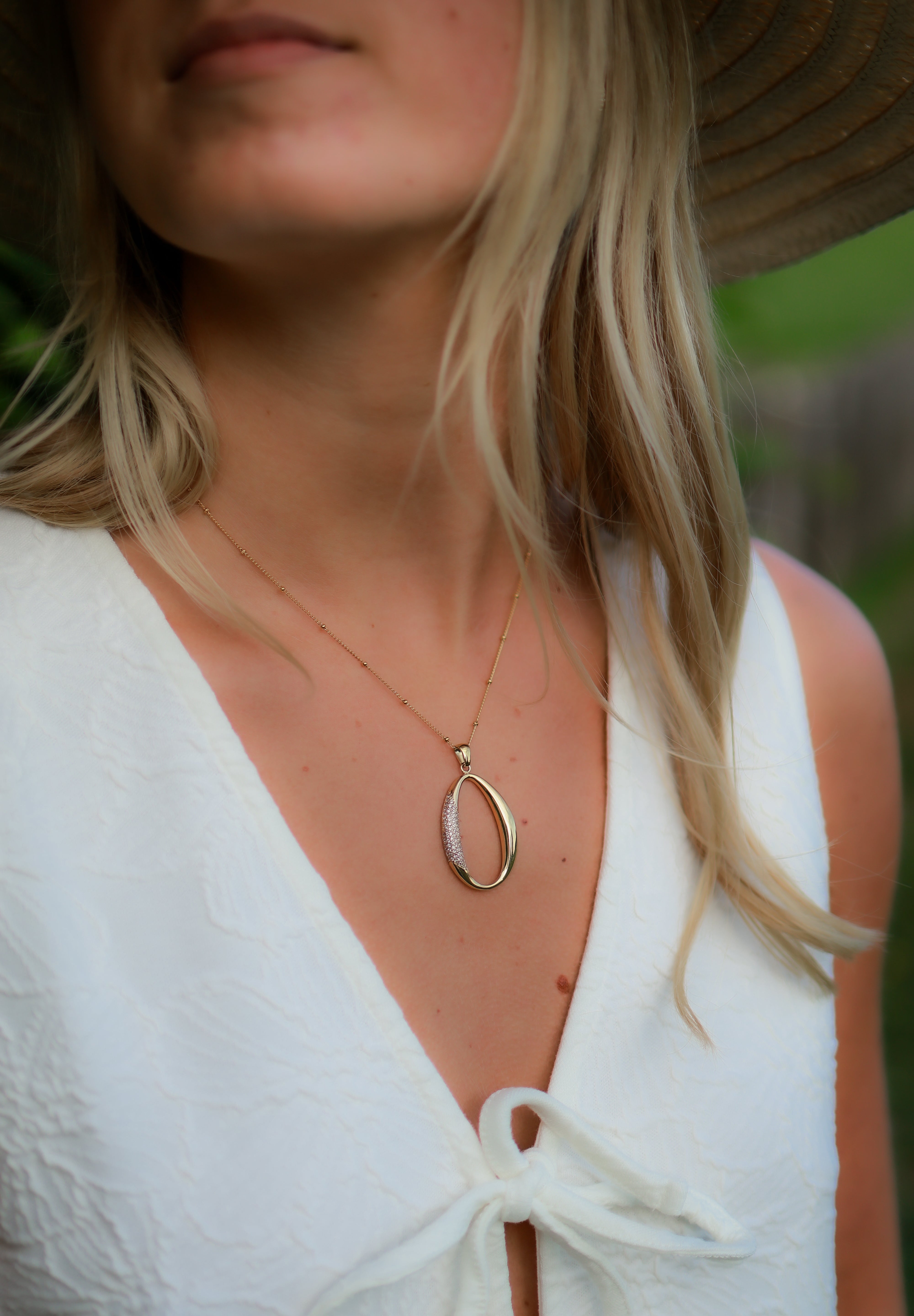 Die Form einer Kaurimuschel war die Inspiration für diesen luxuriösen Anhänger. Mit erstklassigen Zicronia-Steinen besetzt, ist er ein echter Blickfang. Tragen Sie diesen Anhänger dezent an einer kurzen, schmalen Kette oder an unserer langen, verstellbaren Schlangenkette, die Sie mit dem speziellen Schiebereglerverschluss länger und kürzer machen können.