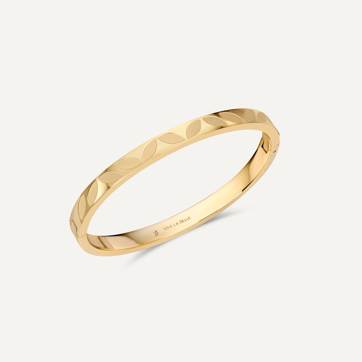 Verleihen Sie Ihrem Look mit dem Olive-Armreif einen Hauch von Bohème-Eleganz. Dieses mit 14 Karat vergoldete Armband ist dezent mit anmutigen Olivenblättern graviert, einem zeitlosen und natürlichen Motiv. Die raffinierte Gravur verleiht dem Armreif einen verspielten Boho-Chic-Look und bildet einen schönen Kontrast zu anderen Stilen in Ihrer Sammlung. Dank des praktischen Verschlusses ist dies nicht nur eine stylische, sondern auch eine praktische Wahl.
